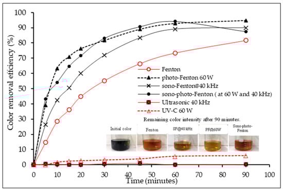 The Fenton process combined with ultrasonic waves and UV–C light was studied at a frequency of 40 kHz. In these experiments, ultrasonic waves were applied with pulse mode alternation every 5 min using 60 W UV–C irradiation. The color removal efficiency of the Fenton process was 81%, with the use of ultrasonic waves and UV–C irradiation with the Fenton process increasing the efficiency of color removal by 8.287% and 13.091%, respectively (Figure 7). Ultrasonic waves and UV–C irradiation decreased the color to 286 ADMI and 285 ADMI, respectively (Figure 7). Color removal using the Fenton process in combination with ultrasonic waves and UV–C irradiation was more than 90% effective in decolorization for 60 min. Using ultrasonic waves and UV–C light significantly increased 🞄OH radical formation in the reactions [12]. However, the color removal efficiency decreased after 60 min, which was perhaps because H2O2 disintegrated into the 🞄OH radical via ultrasonic waves (sonolysis) and UV–C (photolysis) [Equations (1) and (3)]. Due to the limitation of available H2O2, further reaction with Fe2+ was unlikely.