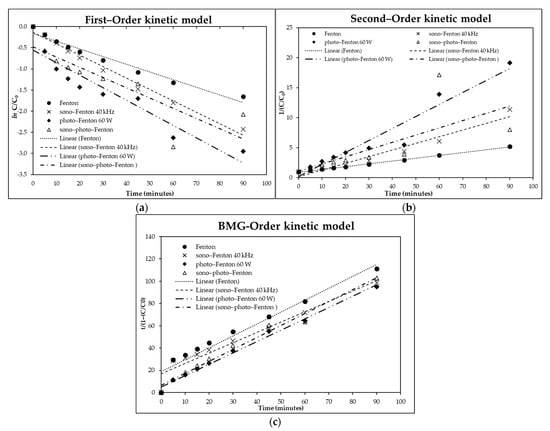 Plot of kinetic model for Fenton process and sono–Fenton process at 40 kHz, for photo–Fenton process at 60 W, and for sono–photo–Fenton process. (a) First –order kinetic model; (b) second–order kinetic model; (c) BMG kinetic model.