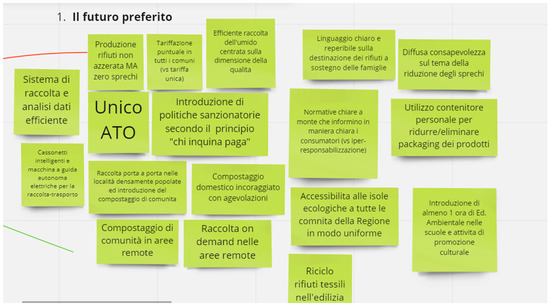 In the articulation of the method, it makes sense to start with Horizon 3, i.e., what emerges at the end of the time frame and represents the desired future. Participants are called upon to implement their sociological imagination to describe what waste management would be like if “things had gone well” according to their point of view. Participants are asked to explore a wide range of new possibilities and to describe them as if they were already implemented and thus capable of producing a certain type of impact.