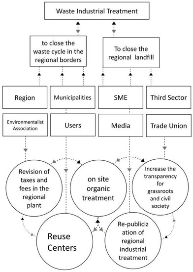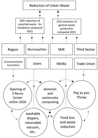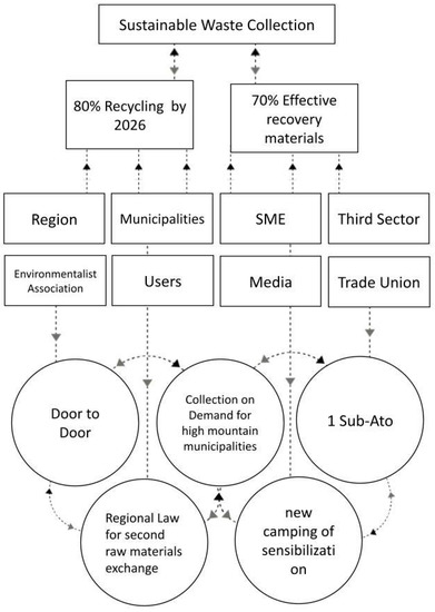 From the results of the participation process, the Zero Waste model emerges [2,3] as the dominant representation of the future, which has the ambitious goal of reducing, to the point of eliminating, the concept rather than the object of waste. It is significant that there was a strong homogeneity of views on objectives and strategic actions among the participants, and that this vision was shared by environmental associations, business associations and trade unions, as well as administrative and political parties.