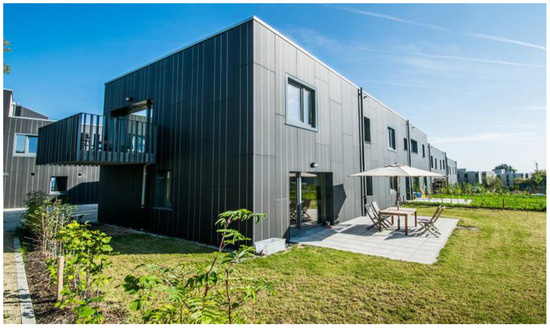 The new neighbourhood is located on the Sart-Tilman site, south of Liege. The site is well served by public transport links to the centre of Liege, due to the proximity of the university. The neighbourhood offers different types of buildings, apartment buildings and semi-detached single-family houses. Several functions are also offered. A majority of the built surface is dedicated to housing but we also found spaces dedicated to commercial functions or to liberal professions and small businesses. In all, we found 40 small apartments, 45 larger units, 11 single-family duplex homes and 6 additional functions (shops and businesses). Private parking spaces are provided near the buildings. The accommodation on the ground floor has a private garden. The neighbourhood meets almost all of the criteria of the efficient neighbourhood benchmark published by the University of Liege. More than 50% of the dwellings are adjoining and the site has a density of 40 dwellings/hectare. The outdoor spaces have been fitted out with more than 30% “green” or “blue” surfaces and there is separate water management for rainwater and wastewater (see Figure 1, showing a 3D view of the neighbourhood studied).
