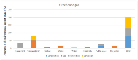 In this section, a mixed scenario was applied: Global warming + heavy renovation of all buildings (100%) + 100% electric cars − solar panels. This scenario allowed for a reduction of up to 90% of total carbon emissions and 90% of the total energy consumption by 2050. Overall, a strong predominance of the occupation phase was noted, which concentrated about 93% of greenhouse gas (GHG) production. Within this phase, mobility dominated, responsible for with 46% of emissions. Next came the heating and domestic hot water (DHW) pair, which represented 24% of emissions, and waste treatment accounted for 15% of emissions during the use phase.
