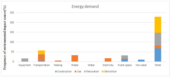 - The primary energy demand due to waste management was comparable to that due to the mobility of the inhabitants and was equivalent to almost a third of the demand for the occupation phase.