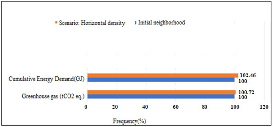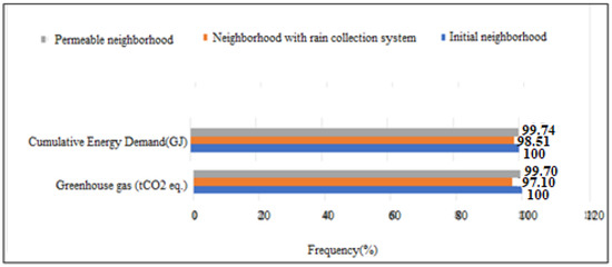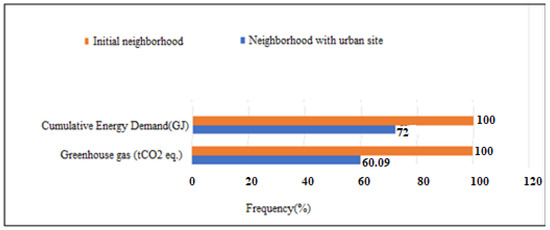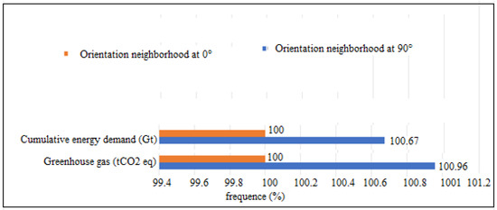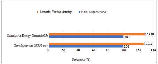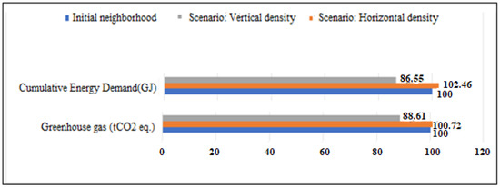 Stephan et al. [27] demonstrated that energy consumption during the operational phase is the main contributor to environmental impacts over the complete life cycle of a district. Indeed, it accounts for nearly 40% of primary energy consumption (PEC) or for more than 42% of greenhouse gas emissions (GHG). However, at the neighbourhood scale, the use phase appears less predominant compared to the other phases. In addition, a study by Nichols and Kockelman [28], relating to the analysis of four districts, revealed that 53% of the PECs derived from construction, 45.5% of the PECs derived from mobility (operational consumption and embodied energy of infrastructures) and only 1% from other public infrastructure (water, wastewater and lighting). By comparing several urban developments of different densities, Norman et al. [29] concluded that mobility contributes much more significantly to the total energy consumed and to GHG emissions in the case of low-density urban development than in the case of dense development. Thus, the share of impacts due to buildings is relatively greater in the case of high density. On the other hand, comparing four scenarios, based on different types of residential buildings, Trigaux et al. [30], showed that the contribution of road infrastructures accounts for 1% to 6% of the total impact. When looking at studies of neighbourhoods with low energy consumption, without taking mobility into account, Herfray et al. [31], showed that, in terms of primary energy consumption, the construction phase accounted for 7% and 13.5%, the operational phase for 92% and 85% and the deconstruction phase for 1% and 1.5%, respectively. Once again, we note the predominance of the operational phase and the weak contributions of the construction and deconstruction phases. Herfray [31], emphasized the fact that architecture also strongly influences performance. With identical technical characteristics, the consumption simulated by the EQUER software varied from simple to triple between two buildings from the same district but in different blocks.