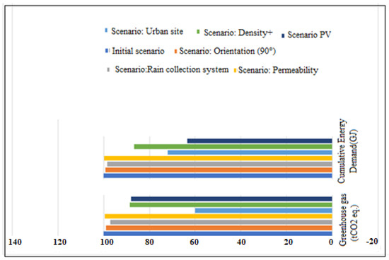 Thus, according to our study, and among all the parameters studied, mobility management had the most impact. This is the parameter that makes it possible to reduce impacts in terms of the greenhouse effect the most. The daily use of individual means of transport by the inhabitants of the district had an enormous impact on the LCA of the district. Eliminating the use of personal vehicles in favour of public transport made it possible to limit the greenhouse effect 4 times more than generating all the electricity in the district using photovoltaic panels. Thus, mobility management must be one of the issues to be addressed as a priority during any reflection carried out at the urban level. Designing a neighbourhood that wants to be sustainable and ecological, while being disconnected from public transport networks, is nonsense.