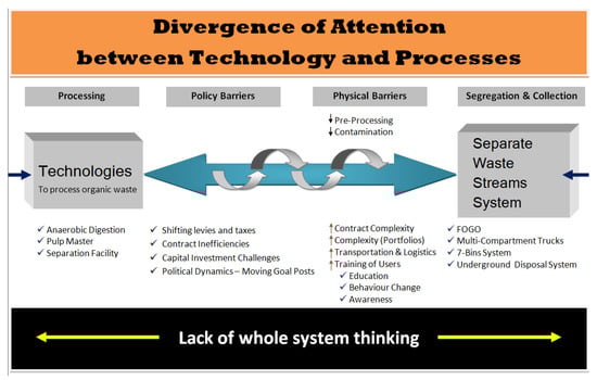 The problem is that governments or councils invest in technologies, and then when it fails due to ineffective innovative strategies with a rigid framework, no goals are achieved. If appropriate technologies are to be implemented, the appropriate policies need to be put into place. A system cannot run without the effective guidelines to guide it. The Divergence of Attention Diagram (Figure 1) represents this ineffectiveness; on one side, there is technology with the support of investments and policies, while the stakeholders in the waste industry are facing and dreaming of a system that is operational, clean and cost-effective—the separate waste stream system. What no one realises is that the separate waste stream system, as a policy, and technological advancements work together. Without the effective and appropriate technologies, such as AD and separate bin collection systems, the separate waste stream strategy cannot work. Both technological and policy advancements need to be made and this can only start “from the top” where funding and investments influence and affect the change needed.