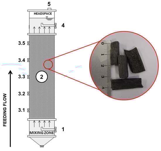 The upflow anaerobic packed-bed reactor (UAPBR) was built in tubular acrylic with a length-to-diameter (L/D) ratio of 9.4, considering a total height of 750 mm and a working volume of 2.370 L. The bioreactor’s bed region was randomly filled with recycled low-density polyethylene (LDPE) pellets to support cell attachment, similar to previous experiments with real wastewater [,,]. Cylinder-shaped particles with a mean diameter of 12.7 mm and ca. 30 mm in height were used with specific gravity and a surface area of 0.96 g·cm−3 and 7.94 m2·g−1, respectively. A total of 295 g LDPE·L−1 was used to build the bed zone, resulting in a bed porosity of 55%. The packed bed occupied 66% of the total volume. A schematic diagram of the reactor is shown in Figure 1.
