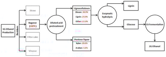 Brazilian sugarcane mills are migrating from old concepts of sugar and ethanol production to a new concept of biorefinery. This concept aims to produce not only biofuels but also electricity, food, and other products that use renewable sources from sugarcane biomass [,,]. One of the main actions to consolidate the biorefinery concept is the implementation of second-generation (2G) ethanol production integrated with first-generation (1G) plants. This industrial concept intends to use surplus bagasse that is currently used as fuel in cogeneration systems, to produce lignocellulosic ethanol (2G) instead []. The utilization of this remaining biomass plays a fundamental role in the biorefinery yield because 1 ton of sugarcane generates 280 kg of bagasse [], which is very significant considering the production of 610 million tons of sugarcane [] in the 2022/2023 harvest.