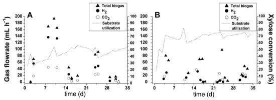 By contrast, experimental condition II contained a mixture of pentoses (xylose, arabinose, and rhamnose; Table 1). These different carbon sources and the presence of furfural and acetic acid could be responsible for lower hydrogen production rate at the beginning of the bioreactor operation. In the study by Aguilar et al. [], the sugarcane bagasse subjected to the same diluted acid pretreatment released approximately 1.2 g·L−1 of furfural and 4.5 g·L−1 of acetic acid, which are considered toxic to fermentation in these ranges [,]. However, the hydrolysate generated in this study was diluted by a factor of 7 (COD decreased from 13,989 to 1989 mg·L−1) before its utilization in the bioreactor, which consequently resulted in lower concentrations of both constituents. Thus, the best explanation for the worst performance in biohydrogen production in condition II was the lower rate of biomass adaptation. Nevertheless, after 11 days of operation, the highest peak of substrate utilization (83.2%) was noticed in this experimental condition (pentose-containing hydrolysate). According to the biogas profile in Figure 3B, xylose was not utilized for hydrogen production. Rather, this substrate was diverted for the production of soluble metabolites. Overall, in both conditions, the reported efficiency in xylose conversion (Figure 3A,B) was considered high because UAPBR was operated at a short hydraulic retention time (2 h).