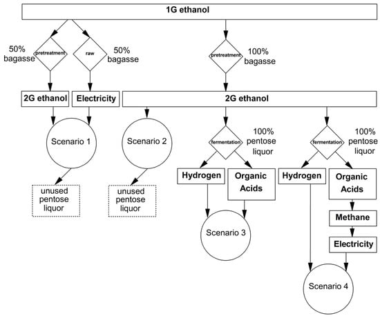 Four different scenarios, namely, 1 to 4, were considered for a medium-sized 2G ethanol plant (milling capacity of 500 ton·h−1), providing a preliminary analysis of pentose liquor as raw material for producing bioenergy and biochemicals. Scenarios 1 and 2 did not include pentose as raw material, whilst scenarios 3 and 4 considered the utilization of pentoses for the energy recovery and/or generation of value-added products. In Scenario 1, 50% of SCB was considered to be used for 2G ethanol production, with the remaining fraction used in the cogeneration of electricity and steam. In Scenario 2, 100% of SCB was directed to 2G ethanol production. In Scenario 3, 2G ethanol was produced with the utilization of all available SCB. Additionally, hydrogen and volatile organic acids (VOA) were derived from pentose liquor. In Scenario 4, 2G ethanol, hydrogen, and organic acids were produced. In this last scenario, organic acid consumption in biomethane production for cogeneration was considered despite the use of chemicals, as reported in Scenario 3.