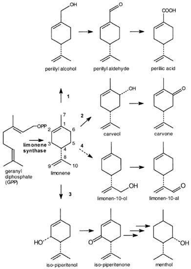 - Maróstica Júnior, M.R.; Pastore, G.M. Biotransformação de limoneno: Uma revisão das principais rotas metabólicas. Química Nova 2007, 30, 382–387. [Google Scholar] [CrossRef]