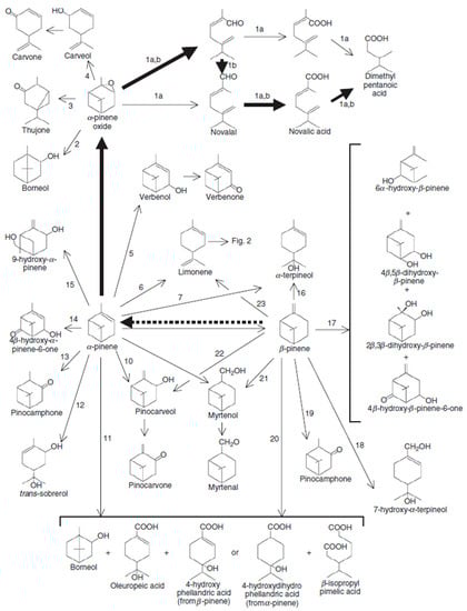 - Yoo, S.; Day, D. Bacterial metabolism of α-and β-pinene and related monoterpenes by Pseudomonas sp. strain PIN. Process Biochem. 2002, 37, 739–745. [Google Scholar] [CrossRef]