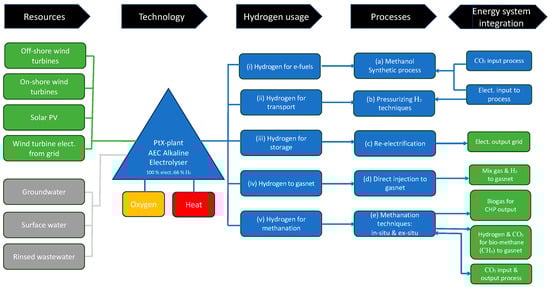 The context in which PtX plants can be deployed, or their planned deployment, will to a large extent define how the technology can be integrated and become a part of the local or national energy system and hence play an important role in the green transition to cleaner energy. Figure 1 provides an overall model of the usability (note: non-exhaustive) of the current PtX technology, with an emphasis on the AEC Alkaline Water Electrolyzer, which is currently the most developed and disseminated technology [,,]. There are a number of critical elements to consider with PtX plants, as described ahead.