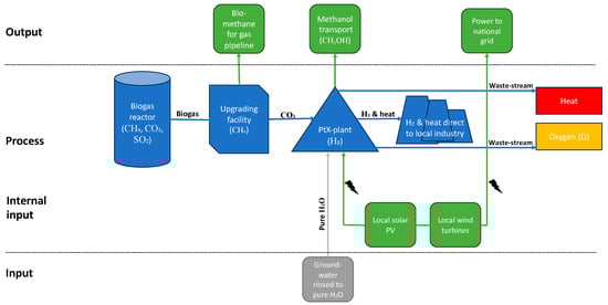 - Making e-fuel via a synthetic process, such as methanol, which would require an input of carbon (CO2) and electricity from the energy system if not provided by local RES sources. The use of biogenetic CO2 in this process could be supplied by upgrading the existing facilities (extraction of CO2 from biogas to produce pure methane) connected to Danish biogas plants, or possibly from decentralized CHP plants fueled by biomass, such as residual straw or wood chips. The co-location of the PtX plant near such facilities would, hence, be beneficial. The use of biogenetic CO2 is important from a symbiotic perspective, as in almost all cases, it would otherwise simply be emitted to the atmosphere from the biogas plants when upgrading their facilities. Currently, 675,000 t of biogenetic CO2 are emitted annually from these energy plants [], and thus not being valorized while also causing environmental issues, including contributing to global warming. Capturing and valorizing this output as a new input to the electrolysis process is therefore important, and carbon capture and utilization (CCU) could thus minimize this current wastage of biogenetic CO2, which could be facilitated within the PtX plant via a classical “inter-firm collaboration”.