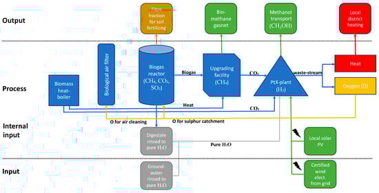 We conclude that PtX in the present development and implementation stage could benefit from co-locating next to biogas plants—as illustrated in the rural case—where upgrading facilities could provide an opportunity for the capture of biogenetic CO2 that is currently being emitted to the atmosphere and hence lost. This applies to both hydrogen for e-fuels and hydrogen for methanation. Using biogenetic CO2 as an input for the electrolysis processes and co-locating these plants in connection with biogas plants would enable the symbiotic usage of carbon and options for the high valorization of various waste streams, such as waste heat, oxygen, wastewater (digestate), and additional biogas yield via methanation. Energy system integration could thus immediately be achieved, as energy outputs would comply with the existing energy system, which would hence stabilize RES sources. Thus, superior internal, regional, and long-distance symbiotic collaborations could be realizable when focusing on biogas plants (‘the rural case’) as drivers for the current PtX development compared to in ‘the city’ and ‘the energy hub’ cases investigated.