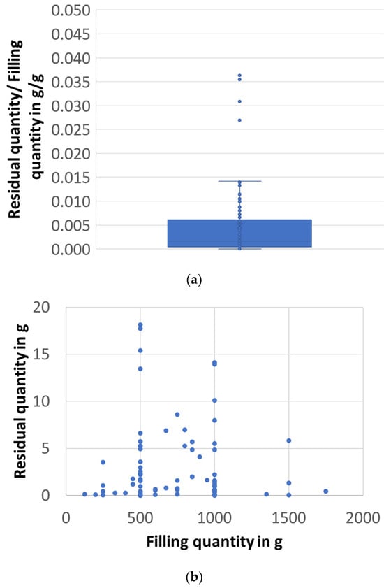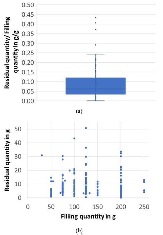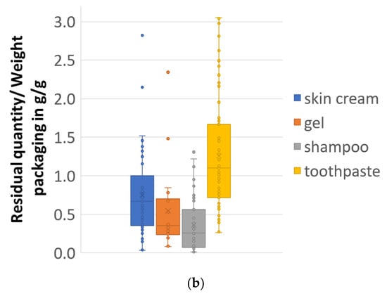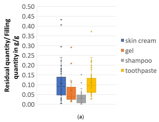 Residual quantities in PE tubes broken down into individual fill products (a) related to filling quantity: cream—n = 78; gel—n = 18; shampoo—n= 43; toothpaste—n= 67; (b) related to packaging weight (with and without closures).