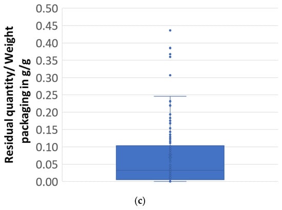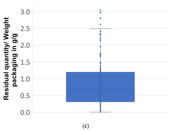 When the residue quantities were related to the packaging weight, it became obvious that residues were a considerable part of the plastic packaging waste. In the case of tubes, the median ranged from 0.26 g to 1.1 g of residue related to 1 g of clean packaging material. For tomato ketchup in PET bottles, a median of 0.36 g of ketchup was observed to 1 g of clean PET material. A median value of 0.17 g of shower gel residue was found to 1 g of clean PE bottles. The lowest median values were observed in PET bottles, with 0.01 g water residue remaining to 1 g of clean PET material. Obviously, the residue amounts measured using samples from recycling plants were lower than those from laboratory experiments. The lower values were an advantage, since residues had to be washed out after sorting and before recycling [,].