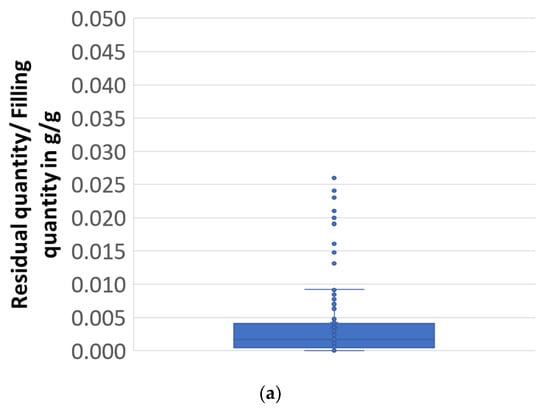 The analysed PP cups were mainly used for dairy products, such as yogurt and desserts, as Kostic et al. already reported []. For 25 cups, the lid was left on the packaging, and for 75 of the cups, the lids were no longer on the packaging. The cups had a filling quantity of 50 to 500 g. The cups composed of PP contained a mean of 0.38 wt. % of residue related to the fill product (Figure 3). The residual quantity did not correlate with the filling quantity. A mean of 0.117 g of fill product remained in 1 g of clean packaging material (cups with and without lids).