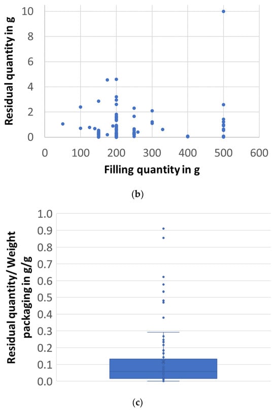 Residual quantities in PE tubes (a) related to filling quantity (n = 180); (b) absolute values depending on the filling quantity (n = 180) (c) related to packaging weights (with closure, n = 125).