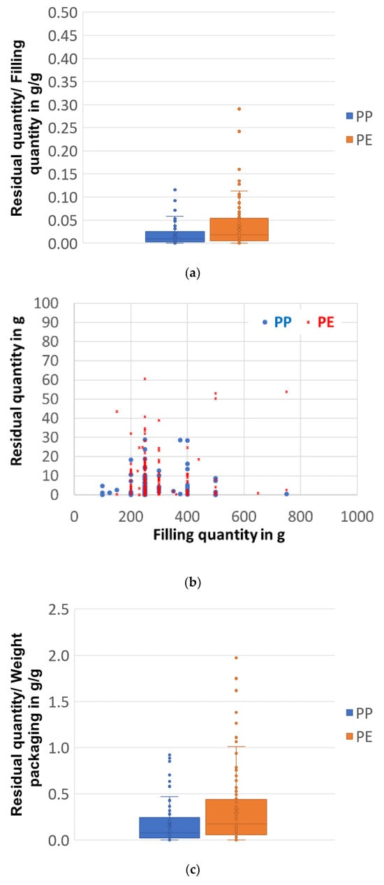 Residual quantities in PP bottles (n = 109) and PE bottles (n = 157) with shower gel (a) related to filling quantity; (b) absolute values depending on the filling quantity (c) related to packaging weight (with and without lids).