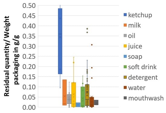 Residual quantities in PET bottles related to packaging weight (with lid) broken down into individual fill products: ketchup—n = 6; milk—n = 3; vegetable oil—n = 14; juice—n = 11; liquid soap—n = 2; soft drink—n = 9; handwashing detergent—n = 47; water—n = 16; mouthwash—n = 3.