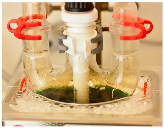 Before starting the purification experiment, some steps of preparation were necessary. The setup had to be cleaned to avoid contaminations. The seals’ and joints’ gas tightness had to be checked as well as the ventilation and power supplies in the fume hood. Before the experimental runs in weeks 3 and 6, rust had to be removed from the steel stands and drill chucks to avoid rust flakes falling into the ultrasound baths. All glass vessels (Fischer Scientific, Langerwehe, Germany), whether they were situated in the reactor, beaker, or flask, were cleaned the same way. First, the remaining high viscosity lubricant was wiped off with paper towels. Then, the vessels were rinsed and scrubbed using Sodosil™ (Sodasil, Sigma-Aldrich, Darmstadt, Germany) and hot tap water. After rinsing the glassware thoroughly with distilled water, a small amount of ethanol was used to accelerate drying. This procedure was also applied to sampling equipment during the experiments. The two gas washers with NaOH, 1M, were prepared by dissolving 28 g of solid NaOH pearls in 700 mL of distilled water for each bottle. Of course, checking the gas tightness of tubes and hoses in the Argon line and behind both reactors was also part of the routine.
