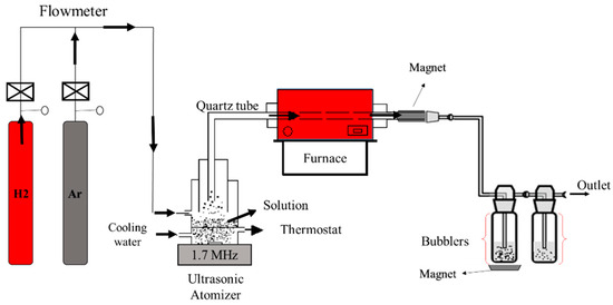 Fe-Co nanoparticles were synthesized through ultrasonic spray pyrolysis followed by hydrogen reduction. Two setups were employed: a low-temperature setup and a high-temperature setup. The setup consisted of argon and hydrogen bottles, a rotameter, a thermostat, an ultrasonic nebulizer connected to a frequency generator, two wash bottles containing deionized water for collecting nanoparticles, and a gas outlet tube. The typical experimental setup is shown in Figure 5.