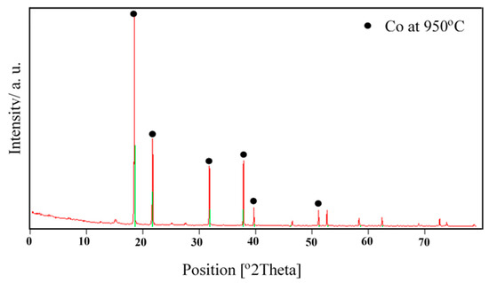 The X-ray diffraction analysis of cobalt powders produced at 950 °C from industrial waste solution using ultrasonic spray pyrolysis and hydrogen reduction is shown in Figure 6. The X-ray diffraction patterns reveal the presence of pure cobalt. It has been reported by [19] that cobalt powders produced at 700, 800, and 900 °C from Co(NO3)2 solution in H2 atmosphere by ultrasonic spray pyrolysis indicated the presence of pure cobalt powders. The previous thermodynamic analysis confirmed the high probability of the formation of Co and Fe from metallic nitrate by hydrogen reduction between 600 °C and 1000 °C. This probability for the formation of Co and Fe increases at elevated temperatures. The expected chemical reactions are presented in Equations (1) and (2):