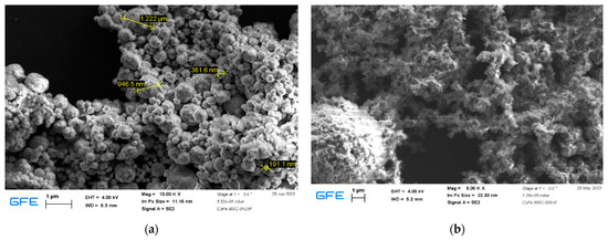 SEM reveals the presence of smooth spherical particles with a range of 191.1 nm–1222 nm using the residence time of 7.19 s, as shown in Figure 7a. In Figure 7b, the agglomeration is more pronounced using a long residence time (23 s). From the SEM results, we can assume that the short residence is more favorable for the nanoparticle synthesis of cobalt. By comparing both results we can notice that the residence time in the quartz tube (length: 1.5 m and diameter 0.05 m) is four times larger than one of the small furnaces.