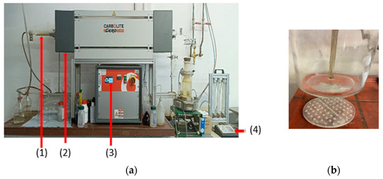 Synthesis of powders with the new magnetic system for collection in cooperation with Redies Deutschland GmbH: (a) experimental setup for USP-synthesis ((1) quartz tube, (2) furnace (Carbolite Gero GmbH &Co. KG, Neuhausen, Germany), (3) furnace control panel, (4) ultrasonic generator (PrizNano, Kragujevac, Serbia) with control unit) and (b) bottle with included magnets.