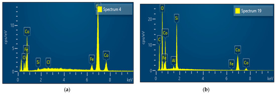 The reaction temperature has a significant effect on the specific surface area, surface morphology, nucleation, and growth of powder particles. Through EDS analysis, the influence of the temperature from 600 °C to 900 °C on the chemical composition of the solution A sample is shown in Table 3. The atomic percentage of Co increases with increasing temperature and the atomic percentage of Fe decreases with increasing temperature. SEM analysis of samples obtained from precursors at different temperatures revealed different distributions of small nanoparticles. The results show the formation of agglomerated spherical Fe-Co particles, crystallographic facets, and spherical agglomerates that are resistant to ultrasonication. Together, these agglomerates form large bulk structures with varying distributions of irregularly shaped small nanoparticles. The changes observed with increasing temperature showed aggregation and irregular shapes of the nanoparticles, ultimately revealing a characteristic layered structure. This means that the elevated temperature is suitable for the synthesis of cobalt, which is in accordance with thermochemical analysis by Gurmen et al. [19,20]. and mentioned results by Tsai et al. [21]. The table shows that the atomic percentage of oxygen decreases slightly with increasing temperature. This increase may be suitable for removing some traces of oxygen, thereby increasing the rate of hydrogen reduction. Silicon and aluminum appear to be temperature resistant; however, Al exhibits a disproportionate change.