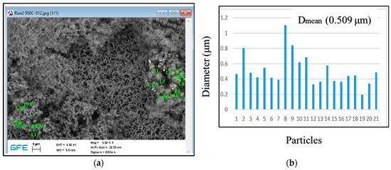 SEM analysis was performed on a sample derived from an industrial solution (Solution C) using USP at 950 °C with magnet collection as shown in Figure 10. The result indicated a multimodal distribution of particles. Particle sizes ranged from 0.194 to 1.101 μm, with a mean size of 0.509 μm. The presence of smaller particle sizes in the sample may lead to distinct magnetic, mechanical, and thermal properties, influenced by the precursor concentration, flow rate, and synthesis conditions. The SEM analysis and comparison of particle size distributions offer valuable insights into the material’s characteristics and behavior, relevant to various applications in magnetic, mechanical, and thermal systems, as shown in Figure 10.