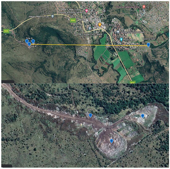 The study was carried out at two specified collection sites in Alice Town. The first site, designated as the study site, is the Alice landfill site, which is approximately 2 km away from the reference site located within the premises of Fort Hare University’s eastern side (as indicated on Figure 1). The landfill site is positioned at latitude 32°48′24.88″ S and longitude 26°49′33.37″ E. Meanwhile, the reference site is located at latitude 32°47′07.35″ S and longitude 26°57′26.10″ E.