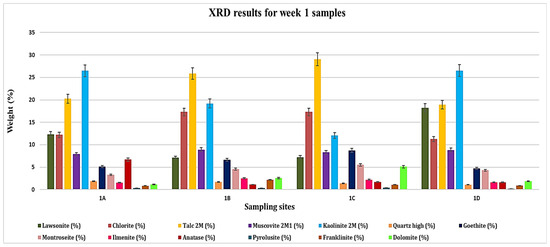 During the initial analysis in week 1, it was observed that Kaolinite 2M was the most prevalent mineral at sampling sites 1A (26.48 wt%) and 1D (26.52 wt%). Conversely, talc 2M was the dominant mineral at sites 1B (25.88 wt%) and 1C (29.04 wt%). The mineral percentages for pyrolusite, franklinite, anatase, and dolomite were consistently lower across all sites, ranging from 0.16% to 6.69 wt%.