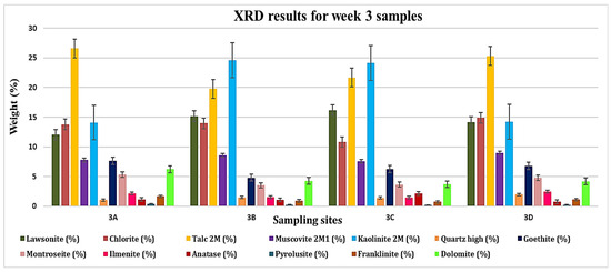 The samples collected in Week 3 indicated a high presence of Talc 2M at sites 3A (26.56 wt%) and 3D (25.31 wt%), while significant amounts of kaolinite crystallites were observed at sites 3B (24.6 wt%) and 3C (24.11 wt%). Additionally, anatase, pyrolusite, and franklinite were found to have minimal mineral composition percentages across all sampling sites.