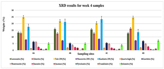 In the analysis conducted in the fourth week, abundant quantities of Talc 2M crystallites were found at sampling sites 4A, 4B, and 4D, apart from site 4C, which exhibited a high presence of kaolinite 2M mineral. Anatase, pyrolusite, and franklinite were detected in minimal quantities across all selected sites.