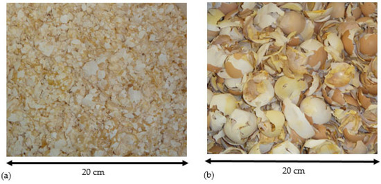 Since chicken eggs are consumed worldwide, the egg industry is globally distributed [13]. The shell is the outermost hard layer of the chicken egg that can be found in a white or brown color [14]. Figure 1 shows eggshell biomass waste color as white (Figure 1a) and brown (Figure 1b). According to the reviewed literature, the amount of calcium carbonate in the white and brown eggshells are considered equivalent [14,67].