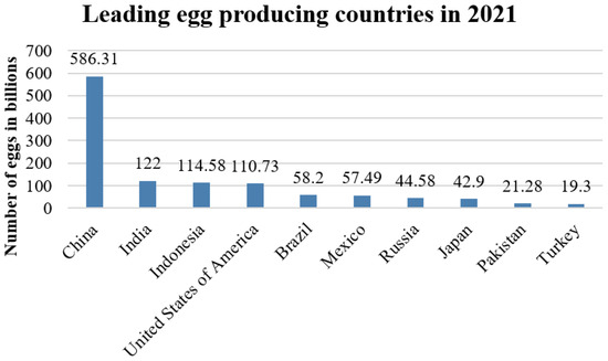 Furthermore, the maximum growth rate in egg production is reported to be in Asia, since China was the largest egg producer in 2021. Also, the second and third place egg producers are India and Indonesia due to the population density of these countries. Figure 3 shows the top ten leading egg-producing countries worldwide in 2021 [103].