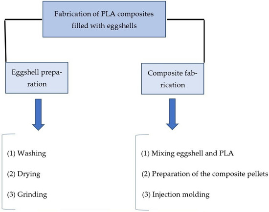 One of the applications of eggshells is in polymer composites, which has been applied as an alternate source of calcium carbonate filler, due to the calcium carbonate content (96–97%) of eggshells [12]. Polymer matrices have been reinforced with mineral calcium carbonate for different applications, such as for the automotive industry, biomedical applications, food and beverage packaging, and general-purpose plastic consumables (e.g., cup and fork utensils). Therefore, it is anticipated that eggshells can serve as a suitable replacement for mineral calcium carbonate for the preparation of polymer-mineral composites [5,36]. Figure 4 is a schematic diagram that illustrates the injection molding fabrication method of PLA composites that are reinforced with eggshells. This technique consists of two steps: eggshell preparation and composite fabrication. First, the as-received eggshells are washed several times to remove organic residues (albumen or egg white) from the eggshells and then dried at 105 °C for 24 h to remove residual water content. After this step, the eggshells are ground to achieve a specific particle size. Second, the eggshell particulates and PLA are mixed in a twin-screw extruder, and pelletized composite material is fed into an injection molding machine [115].