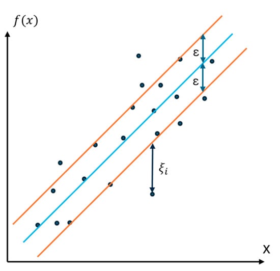 The first term represents the weights vector’s norm, minimizing that ensure to obtain a simple model with a regression function that is as flat as possible. The second term represents the deviations of the predicted values from the actual ones that exceed the tolerance margin ε by a value , defined as the slack variables. is a regularization parameter that determines a balance between the minimization of the two terms [45].