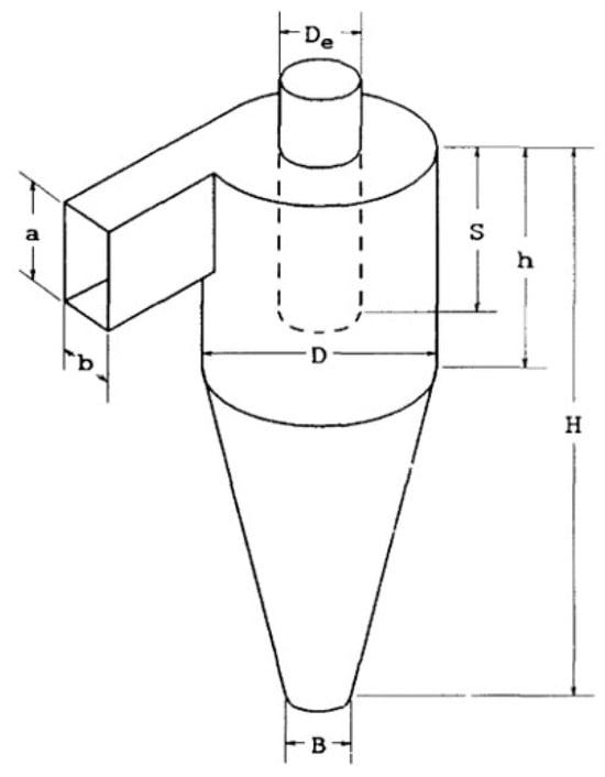 The geometry of the tangential-inlet reverse-flow cyclone considered in this study is reported in Figure 3.