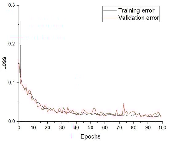 Table 3 shows various combinations of the training batch size, n° of epochs, activation function and optimization algorithm hyperparameters and the corresponding MTE, MVE and MTA obtained in the various BPNN training steps. As mentioned in Section 2.2, the criteria to select the best combination of parameters was to minimise the MTE and MVE and maximise the MTA. Results show that the achieved MTE, MVE and MTA in training ID 5 (bold highlighted) are the most satisfactory. The training 5 exhibits a consistent reduction in both training and validation losses compared to others suggesting a well-generalized model, as there is no evident divergence between the two loss curves and so there was no overfitting during the training process. Based on these results, the BPNN with these hyperparameters was selected as the final model for predicting the cyclone collection efficiency. Figure 4 shows the values of the train and validation loss as a function of the n° of epochs for the selected combination of hyperparameters.