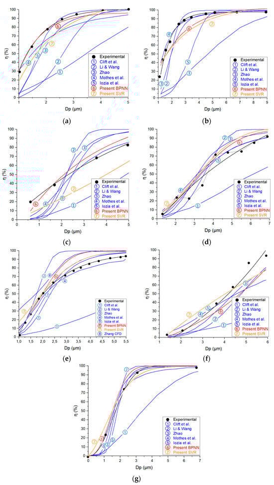 The reported results can be visualized by comparing the collection efficiency curves predicted by the present BPNN and SVR models with those of the semi-empirical and statistical models from the literature, as shown in Figure 5a–g.