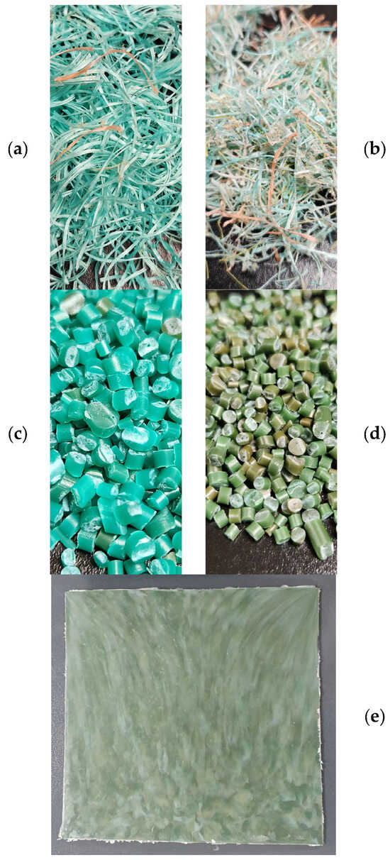 (a) Shredded new fishing ropes; (b) shredded used fishing ropes; (c) new fishing rope pellets; (d) used fishing rope pellets; (e) used fishing rope panel.