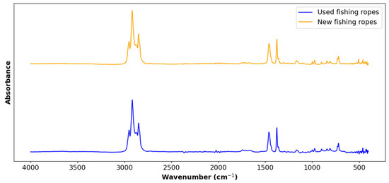Figure 3 displays the FTIR spectrum of the two types of ropes. The peaks at 718 cm−1 (-CH2- rock), 729 cm−1 (split -CH2- rocking vibration), 2848 cm−1 (-CH2- symmetric stretch), 2914 and 2954 cm−1 (-CH2- asymmetric stretch), and 1377 cm−1 (-CH3- umbrella bending mode) correspond to the characteristic signal of polyethylene [40]. Meanwhile, the peaks at 840 cm−1 (C-CH3 stretching vibration), 997 and 1165 cm−1 (-CH3- rocking vibration), 1375 cm−1 (symmetric bending vibration of -CH3), 2952 cm−1 (-CH3 asymmetric stretching vibration), and 1455, 2838, and 2917 cm−1 (-CH2- symmetric bending, -CH2- symmetric stretching, and -CH2- asymmetric stretching) are typical isotactic polypropylene peaks [41,42]. The peak at 1255 cm−1 may be attributed to the presence of small amounts of polyvinyl chloride [43]. This was not expected but could be due to PVC-coated wire lobster trap debris in the ropes [44].