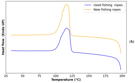 The polymers in the used ropes presented acceptable degrees of crystallinity, as they are higher than the ones found by Stewart et al. [56], who reported degrees of crystallinity of 10.71% and 25.96% for virgin HDPE and PP, respectively, in a 25% HDPE and 75% PP blend.