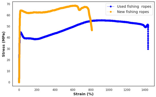 Stress–strain curves for the used and new fishing ropes.
