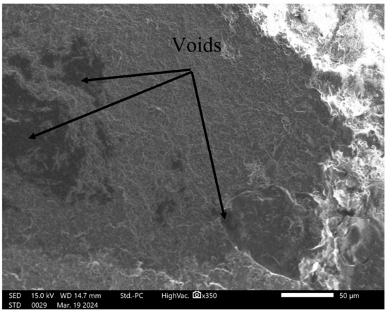 The microstructure of the specimen from the flexural testing was analyzed using a JEOL’s NeoScope JCM-7000 (Easton, MD, USA) benchtop scanning electron microscope. Images of the microstructure were captured at a landing voltage of 15 kV and a magnification of 350×.