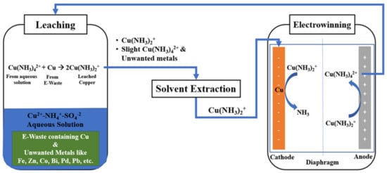 Koyama, Tanaka, Miyasaka, et al. [5] studied the cuprous ammonia complexes in the ammonium sulfate solutions and demonstrated their selectivity towards leaching copper. It was also more current efficient (i.e., >95%) in the electrowinning stage. The reason for the current efficiency not being 100% was attributed to the presence of Cu(II) in the solution [5]. To further elucidate the proposed copper ammoniacal system found in literature and herein. A leaching, solvent extraction and electrowinning circuit for copper-ammonium systems is presented in Figure 1 which shows the pre-existing Cu(II) in the electrolyte acts as the oxidizer, leaches the metallic copper in the feed sample, and produces Cu(I) with some slightly leached metallic impurities. The leached solution goes through solvent extraction to remove the metallic impurities and Cu(II). The purified Cu(I) solution goes to the electrowinning cell in the cathodic compartment, where Cu(I) accepts an electron, reduces to metallic copper, and deposits at the cathode. The spent electrolyte solution goes across the separating membrane to the anodic compartment to oxidize the Cu(I) to Cu(II) to reuse the electrolyte for leaching [6]. The diaphragm represented in the electrowinning compartment is supplied to minimize the transport of Cu(II) to the cathode. Several examples are possible see [7].