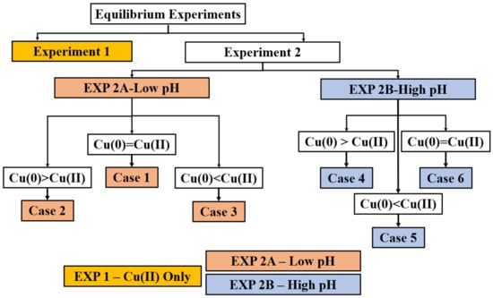 Originally, Experiment 2 (A and B) was designed as a singular experiment plan. However, upon reviewing the results, it was determined that the experimental space would be reduced to more appropriately quantify the results based on the underlying mechanism. For this reason, Experiment 2 was further subdivided between low pH and high pH areas owing to the different mechanisms. Further, conceptually, six cases were developed to categorize the mechanism dominant in the Cu(0), Cu(I), and Cu(II) space. These cases are defined by pH range and the relative abundance of oxidant (Cu(II)) or reductant (Cu(0)). In the case of the 2A experiments, Cu(II) was saturated owing to the low pH. The 2B experiments represent a set concentration of Cu(II) lower than saturation. Experiments 2A and 2B are further defined and presented as follows. Note the reflection of saturation vs scarcity between 2A and 2B in the context of oxidizer (Cu(II)) and reductant (Cu(O)).